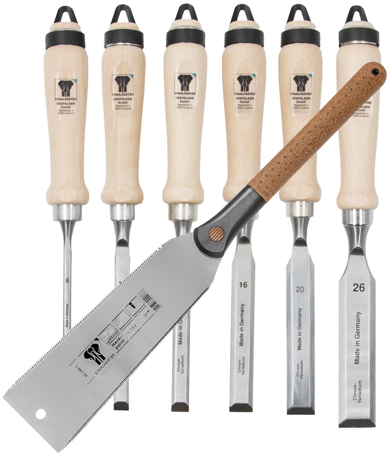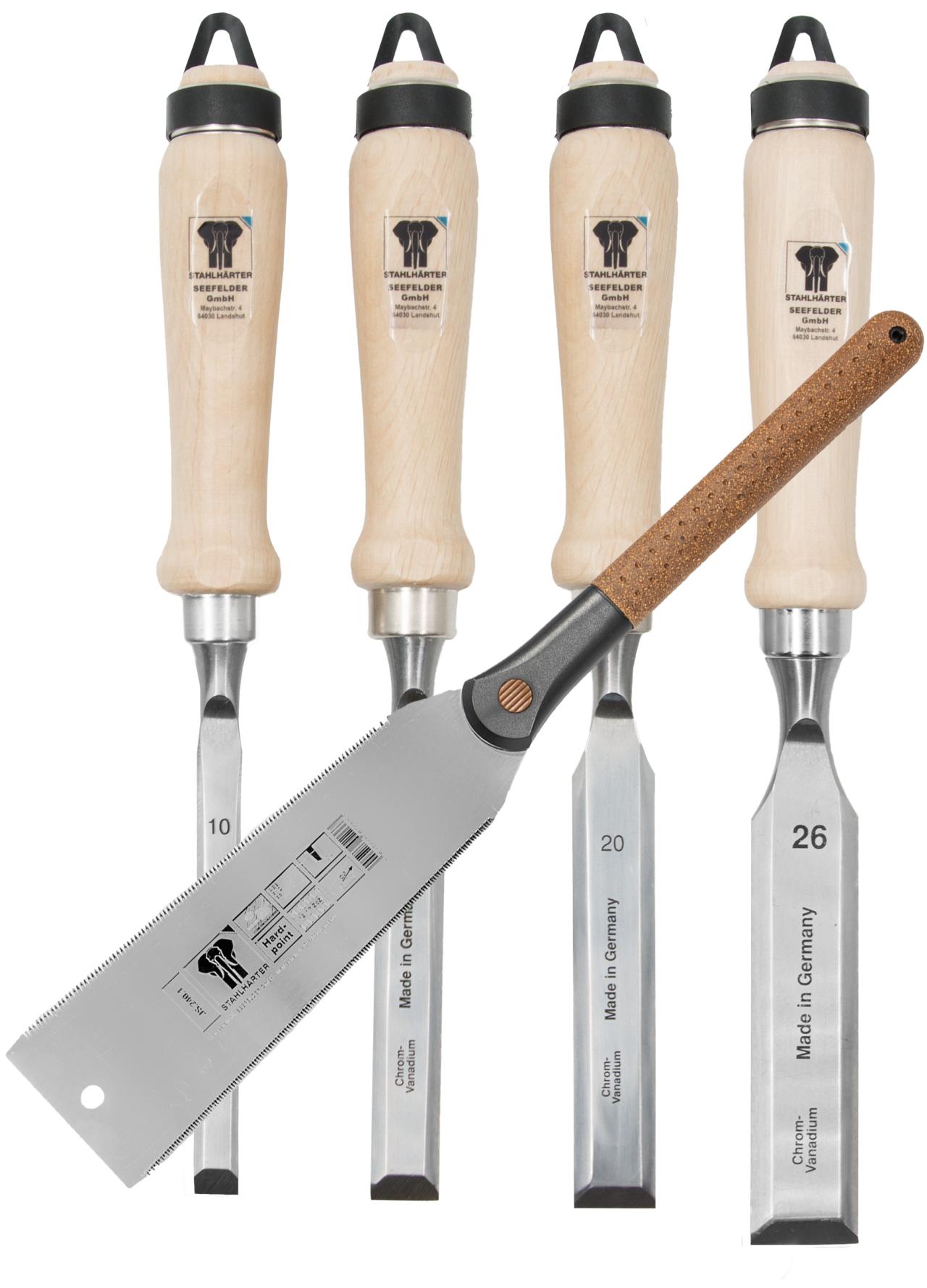 Praktická sada se čtyřmi sekáčky a japonskou pilkou v osvědčené kvalitě STAHLHÄRTER. Dláta zaujmou kvalitním ostřím z nástrojové oceli a rukojetí z habrového dřeva. Vysoká odolnost ostří a optimální použitelná délka čepelí činí ze sekáčů skutečně kvalitní nářadí, zatímco japonská pila s dvoubřitým pilovým listem umožňuje jemné a přesné řezy do dřeva a plastu.