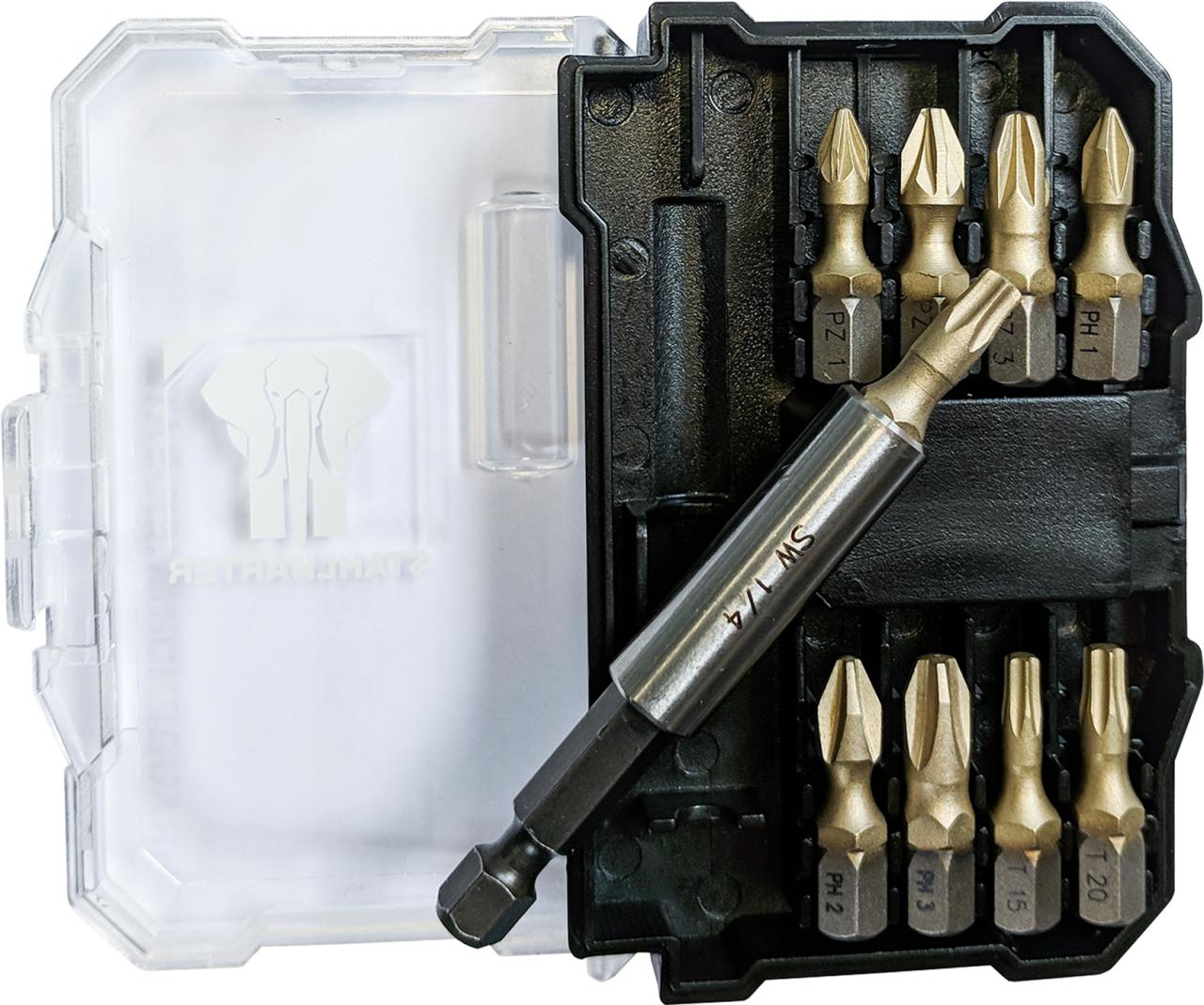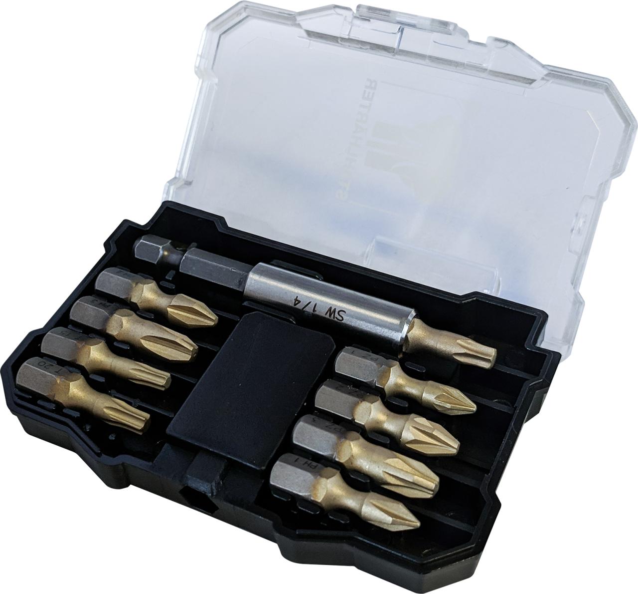 Praktický box na bity s atraktivní nabídkou různých bitů s pohonem PH, PZ, drážkovým a TX. Sadu bitů doplňuje rychlovýměnný držák bitů a záhlubník.